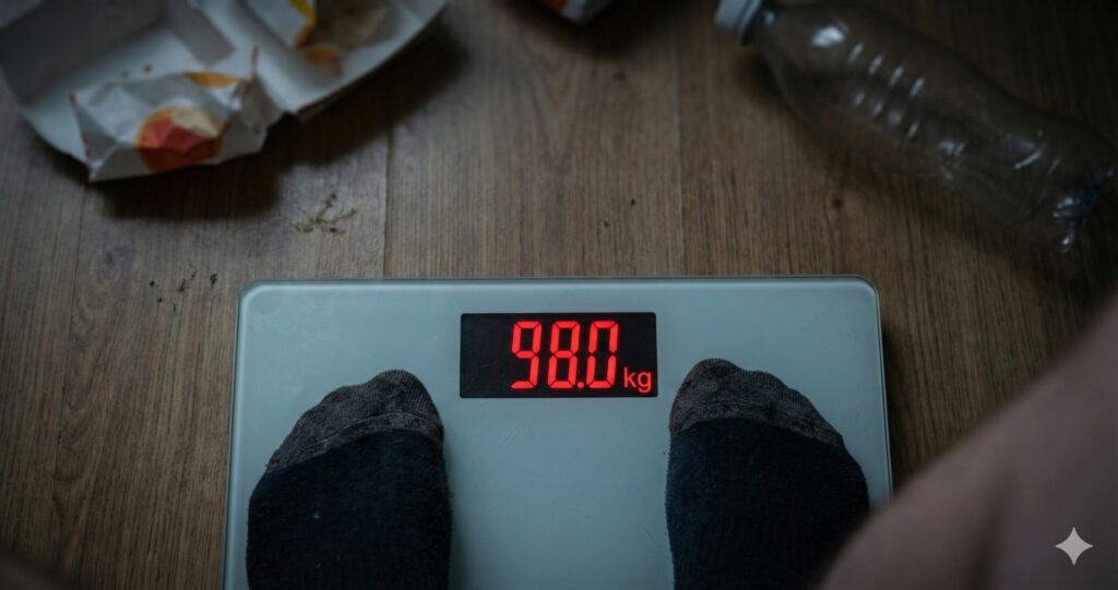 そして、恐怖が襲ってきました。 このままいけば、体重は指数関数的に増えていく。 100kgの大台なんて、きっとすぐそこだ。 一度そこを超えてしまったら、もう二度と「普通の体型」には戻れないんじゃないか……。