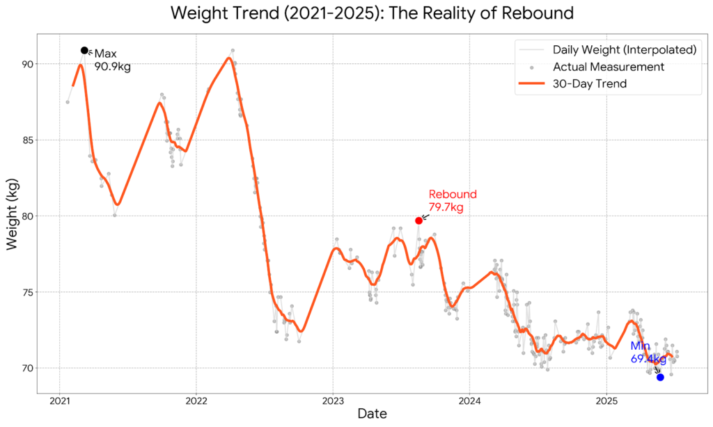 でも、現実はそんなにカッコいいものではありませんでした。 まずは、僕の**2021年から2025年までの「全体重記録」**を見てください。